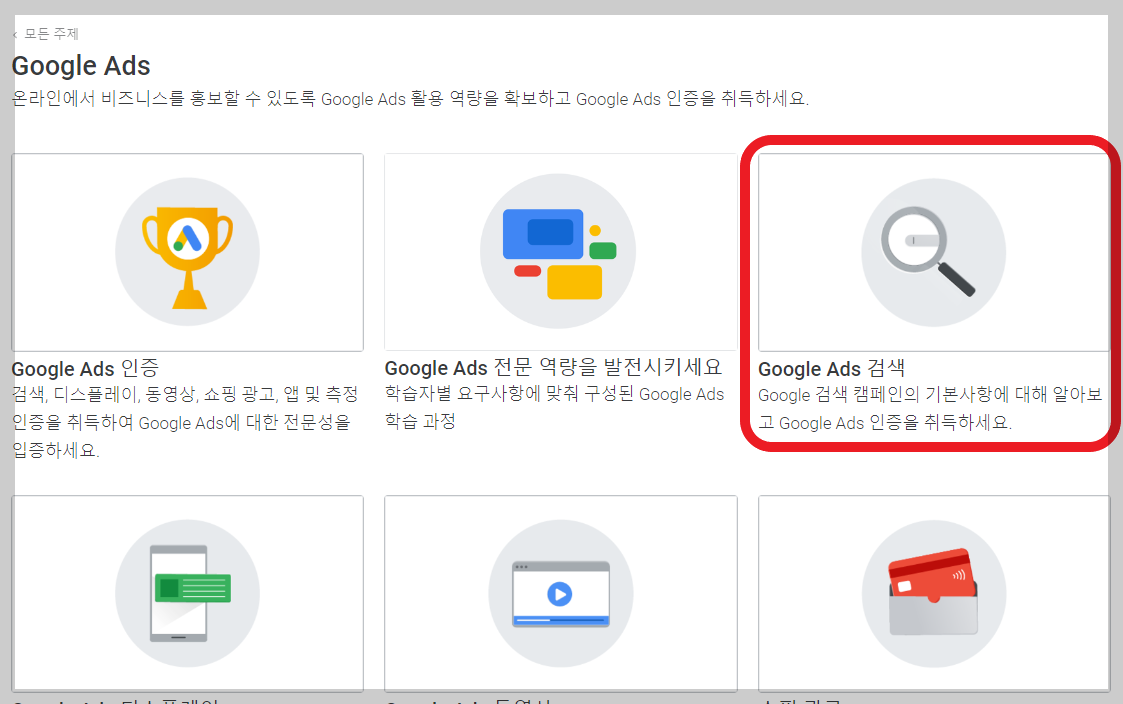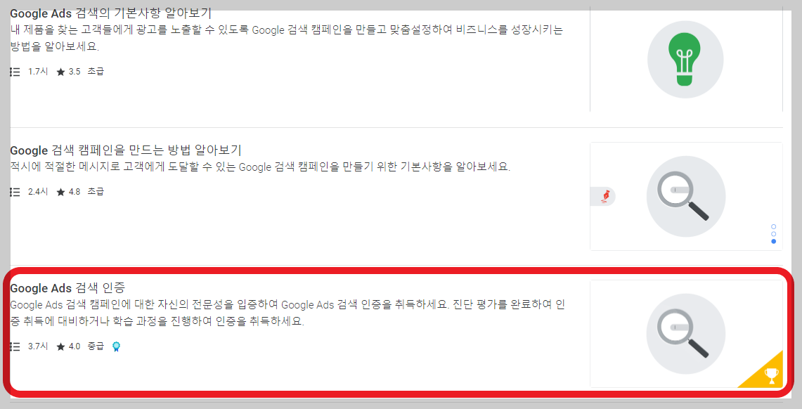 가장 활용도가 높으며 보통 구글애즈 자격증을 인증받았다고 하면 검색 자격증을 떠올리기도 하죠